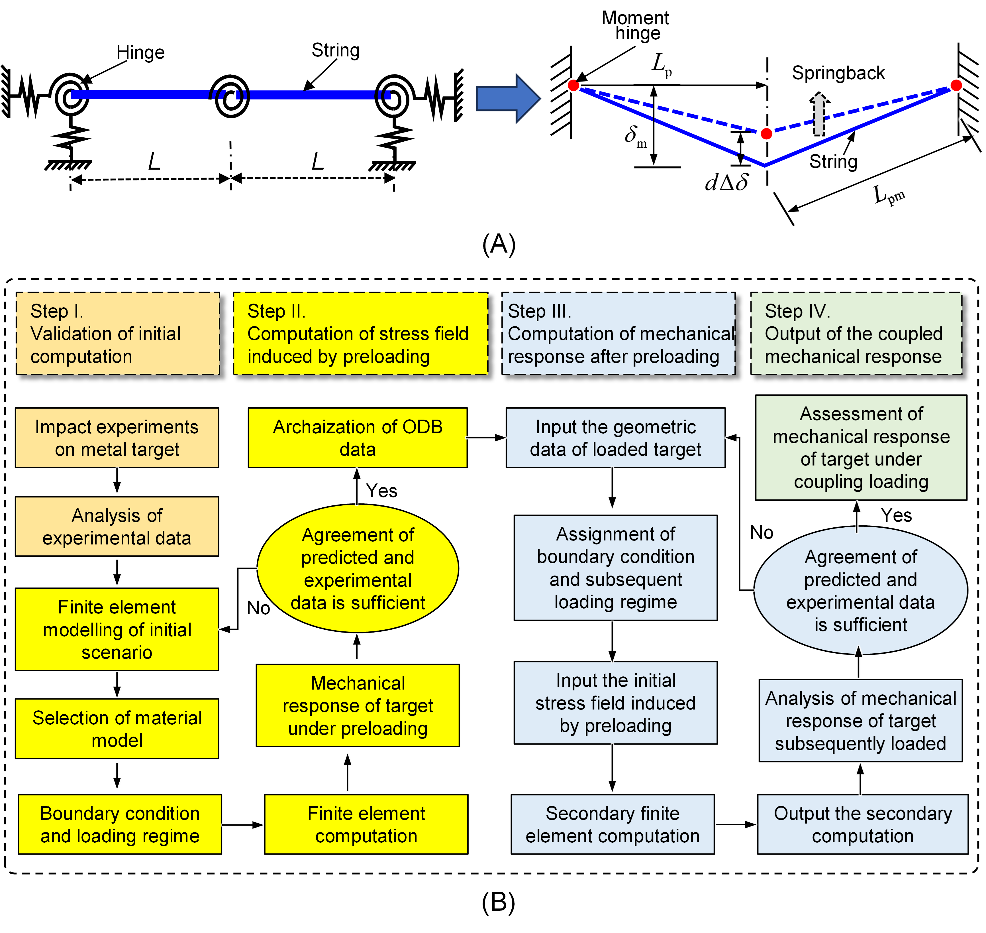 图1 (A) 固支金属梁的简化弦铰模型示意图,(B) 隐-显联合仿真流程图
