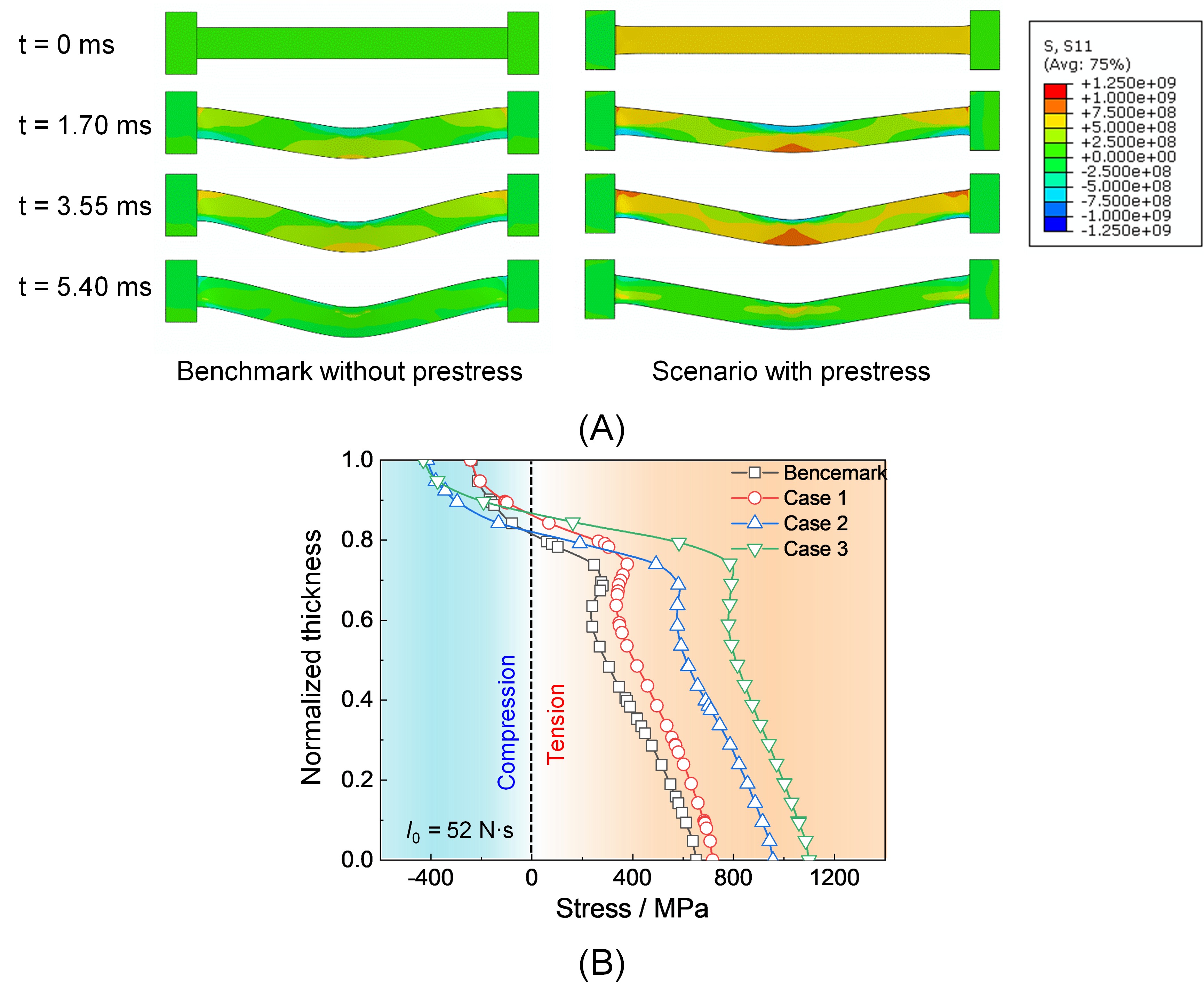 图2预拉伸应力对固支金属梁轴向应力 (A) 轴向分布云图以及 (B) 相对厚度分布的影响